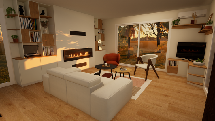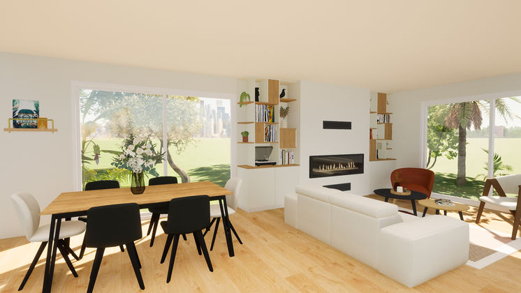 J'ai conçu un meuble de chaque côté de la cheminée comme une bibliothèque avec des rangements bas fermés. Pour la partie haute, c'est composé d'étagères ajourées et de niches fermées en jouant sur les matières. Cela donne de la légèreté au meuble, du rythme , ainsi que de l'élégance dans le salon. J'ai travaillé les finitions du côté gauche, avec des étagères arrondies pour donner de la douceur, et pour y placer de jolies objets décos. Ce meuble liera l'espace salon à la salle à manger tout en douceur.